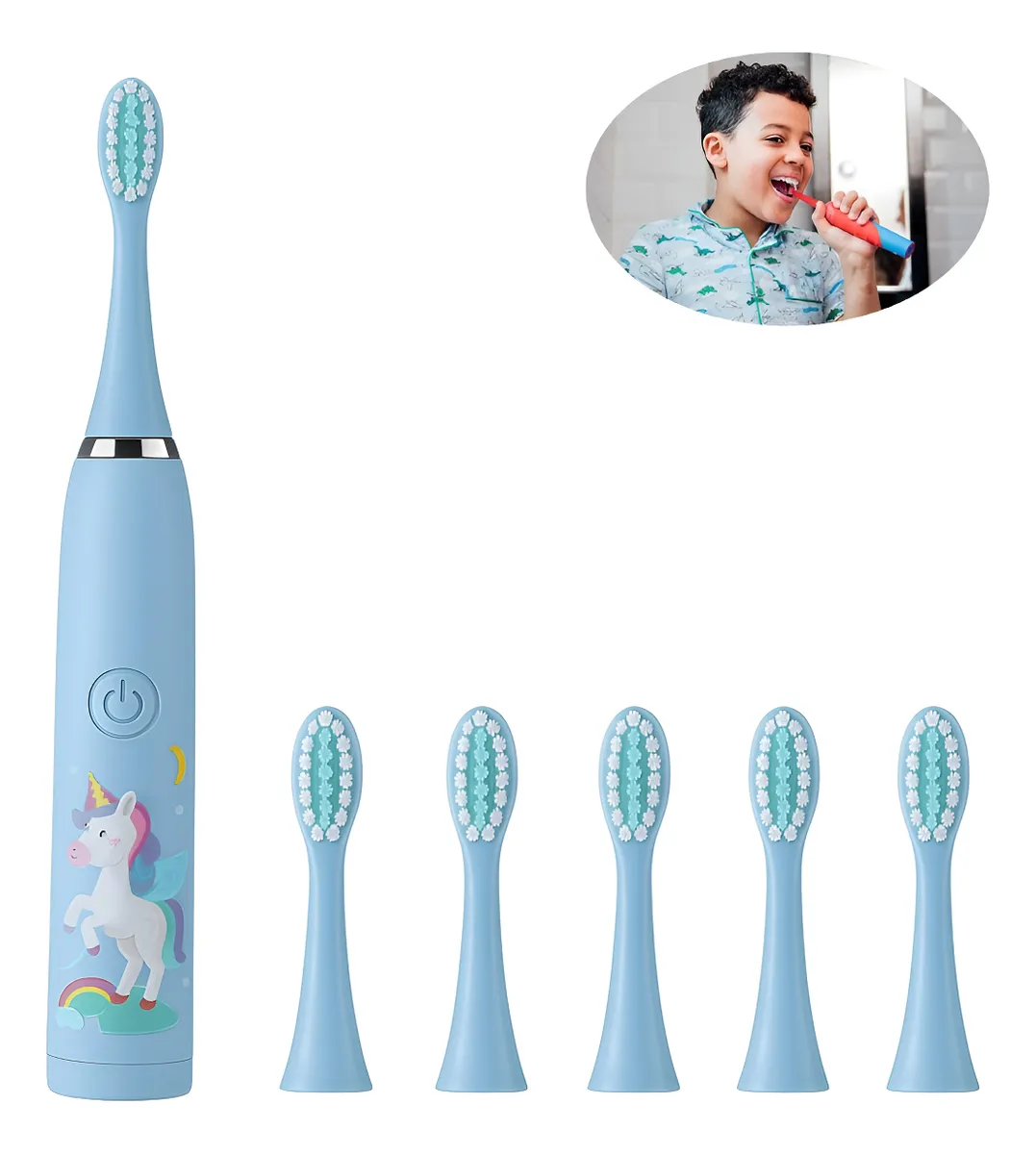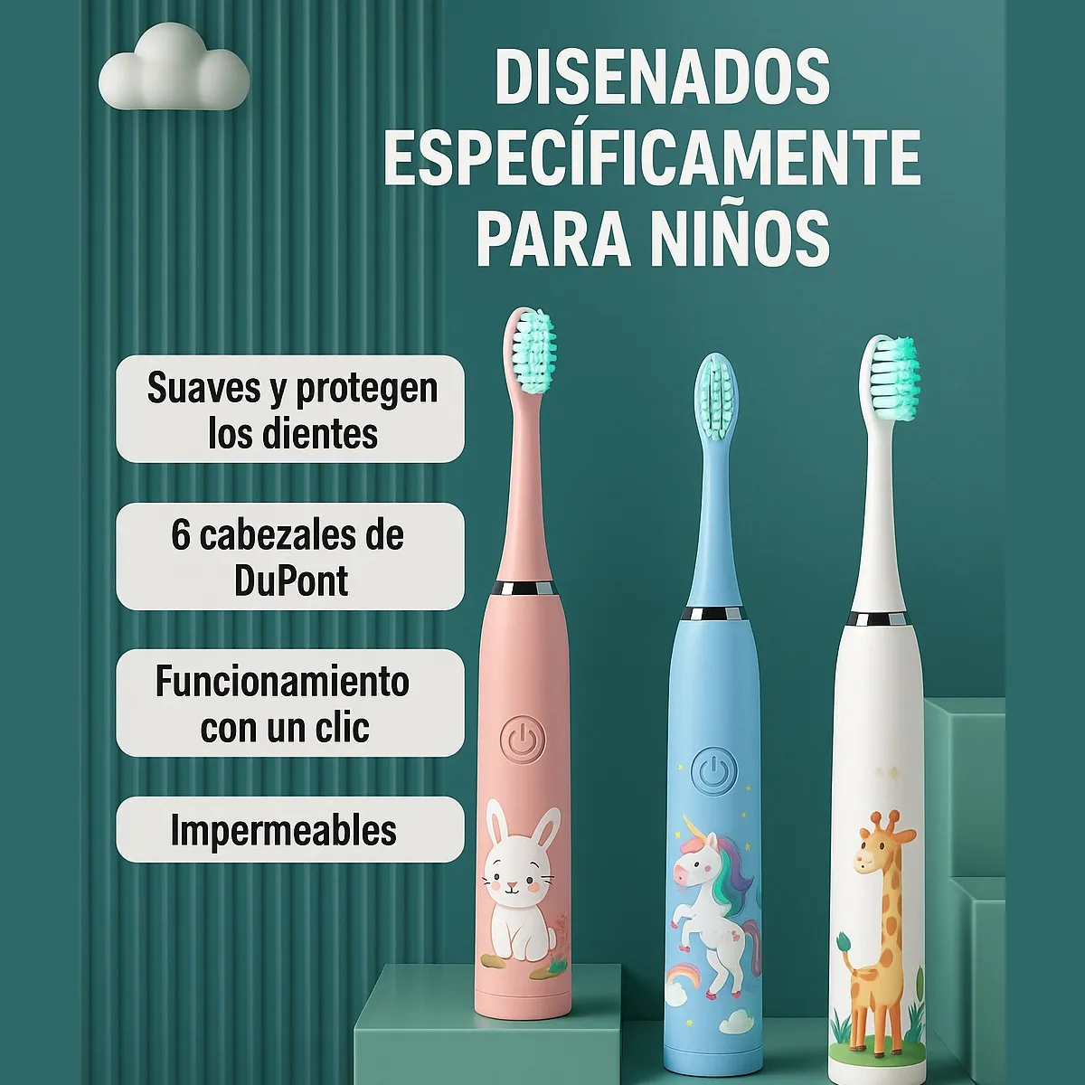 El cepillo dental eléctrico infantil de Deluxe Bazar combina tecnología ultrasónica con un diseño tierno y funcional. Disponible en rosa celeste, blanco, o rojo. viene con 6 cabezales (1 colocado + 5 repuestos) y una vibración suave ideal para el cuidado diario de los dientes y encías de los más chicos.